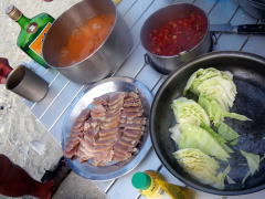 ハッピーアワーのおつまみは、先週獲ったクロナマコ。 那覇に帰ってこしらえて、凍らせて持ってきました。 たまねぎのスライスと和えてなまこ酢で。 たっぷりコラーゲンで、さっぱりした味です。 |
