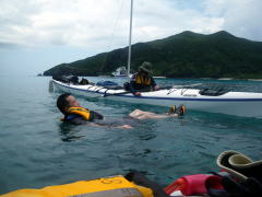 今日は京都と千葉からKさん、KMさん、元気な女性お二人が遊びにいらしてくれました。 シーカヤックは初めて、ということだったんですが・・・ カヤックを海辺まで運ぶだけで体中がHOTになってしまうので、 とりあえず、カヤックは置いておいて 海の中でクールダウン。 このままずっと泳いで行ってもいいかな〜 |