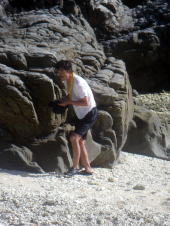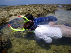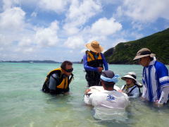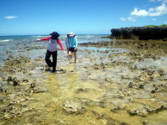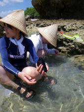目のおっきい魚(たぶん、ハゼ)をずーっと覗いていたり、 普段はさわる機会の少ないナマコをさわってみたり、 「気持ち悪いっ!!」と言いながらずっと触ってますよ、KMさん! |