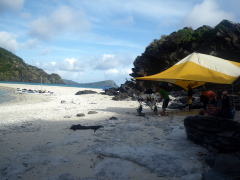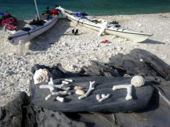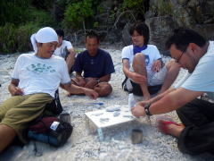 Iさんのサンゴ工作教室がひらかれたのは2日目の午前中。 みんなが太陽の殺人光線から逃げ、ビールやコーヒー泡盛を飲んでいるときでした。 「これいいんじゃない?」 と最初に作られたのは、写真真ん中の足がかわいい恐竜。 次々に「souten」、「CAMP」、「PROP−i」のロゴができていきます。 |