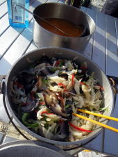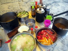 2日目のハッピーアワーと夕ご飯の風景。 この日は雨の心配はあまり(?)いりませんでした。 いい風の吹く夜。 夜中3時には、満天の星空が見えたそうです。 |