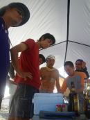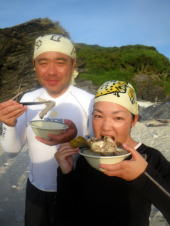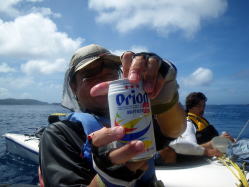 「ビール!ビール!オリオンちょうだい〜♪」 と海の中から来た3名。 カヤックを漕いだ後に、海の中でクールダウンしながら飲むビールはすすみます〜♪ |