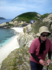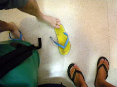 渡嘉敷港にフェリーが着いた途端、Tさんのサンダルの鼻緒が切れる・・・ いや、2ヶ所が切れてなければ大丈夫!なわけもなく。 なんだか不吉な感じ、、。 港の売店で、すぐに同じサンダルを買い、気を取り直して スタート地点の渡嘉志久湾に向かいます。 |