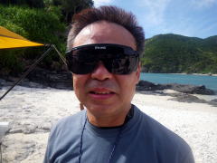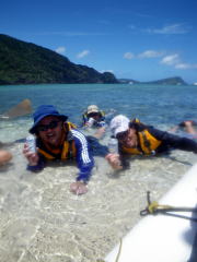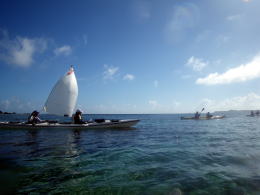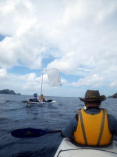 2日目は座間味島を一周することになりました。 Oさん&大城艇は風を受けて、セールで帆走。 Tさん&まき、Aさん、Kさんは必死で二人の艇を追いかけます。 途中、双胴艇とサバニとぶつかりそうになって危なかったです。 シーカヤックの速度をわかっている船長さんは、やはり少ないようです。 |