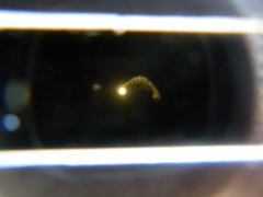 IB夫妻が持ってきてくれた日食グラスから見た太陽。 黄色く見えることにビックリ。 こんな風に見えるんだ〜 まだ、太陽は欠けていません。 欠けたときにきちんと見られるように練習練習。 |