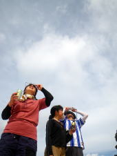 欠け始めてから、とリあえずビールで乾杯!! 欠け終わるまで2時間以上あるので、みんな思い思いに時間を過ごします。 そのまま太陽を見ると、視界がピンク色になってしまうので(これにはびっくり!!) 日食グラスを持っていないひとは、サングラスや 雲が太陽にかかったときに見える欠けた形を見ていました。 夏の太陽の強烈さがなくなってきたなーと思ったら、 セミの声がなくなり、 風もさっきより少し強くなったような・・・ 欠けていくと、夕方のような景色になっていきました。 |