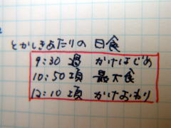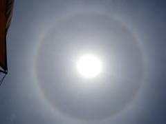 太陽のまわりにおおきな円。 太陽がかけ始めて、かけ終わるまでの間ずっと、虹が見えていました。 |