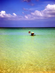 最終日の午前中、渡嘉志久ビーチに帰る前にハナレに遊びに。 残念ながらスクは寄ってきていませんでしたが、 初めてみる海の綺麗さにみんな、ため息。 午後の時間の海の色もとてもいいんですよ〜 |