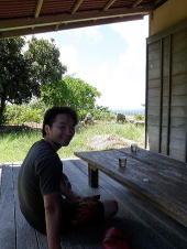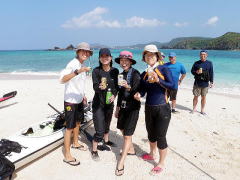 今回のメンバーは、左からK村さん、O関さん、A部教官、 Cちゃん、O平さん、シーカヤック初挑戦のSのさん。 写真は、ちょうどムカラクに着いて乾杯!しているときに大城が撮ってくれました。 |