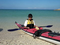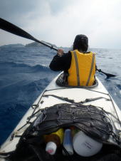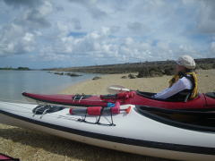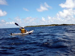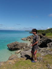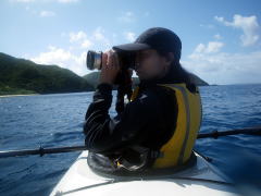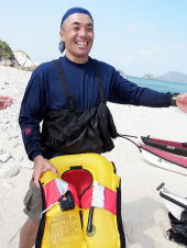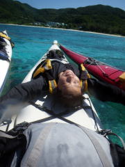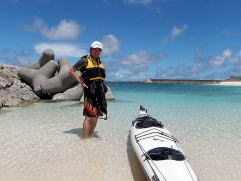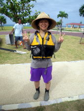 今日のゲストは東京からお越しの若○さんです。 これまでオープンカヤックとリバーカヤックをそれぞれ1回のみ漕いだことがあるそうです。 何時もは自転車を漕いでい基礎体力があるので久高島までの往復15kmは簡単に漕ぎきりました。 |