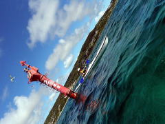 志喜屋の航路標識にとまっているアジサシを見に行ったが、標識にスターンをぶつける。 おっとと・・・カメラがぶれてしまいました。 |