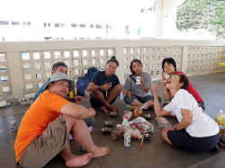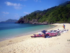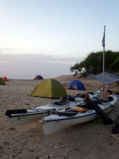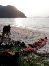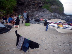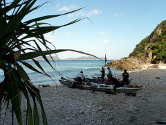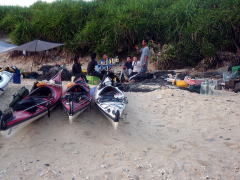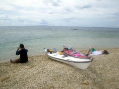 4泊5日組が先に渡嘉志久ビーチから南のクンシというビーチまで漕ぎます。 夕方の高速船で渡嘉敷に到着したA部教官は、自艇のフェザークラフトK−1を組み立て、 夕ごはん、ぎりぎりにクンシに到着。 フライトの関係でA部教官は、今回2泊3日の参加なんです。 よやく8名みんなが揃って、ハッピーアワーと夕ごはんを食べていました。 と、そのとき・・・ |