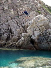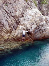 2日目、阿波連のクンシから慶良間海峡を渡って遊びに来たのは、通称「飛びこみ島」と呼ばれるムカラク。 「行くぞっー」 早速、A部教官から飛んで行きます。 やっぱり先生。先頭きってお手本を示してくれます。 続いて、岩の上から下を見て「ここからかぁ・・・」と悩む二人(笑)なんとか岩に引っかかることなく飛べました。 かと思いきや、きれいなTの字の態勢で迷うことなく飛び降りるK村さん!! |