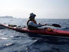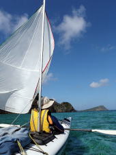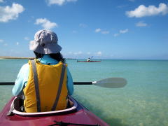 ほら、二人とも漕いでない(笑) 本当に天気のいい日で、漕ぐ手がほんとにとまりそうでした。 浅いところは、今の時期何m下まで見えるんだろうと思うくらい透明度が高いです。 海の中ばかり覗いていると、セーリング艇に置いてかれちゃうんですが。。。 |