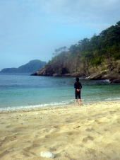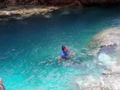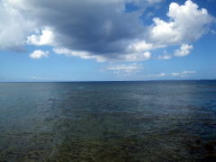 そのあと時間いっぱいまで、シュノーケリングしたお二人。 40分は海に入っていたと思います。 岩の上から写してみたけれど、白い雲と蒼い海に二人の姿は溶けてしまっていました。 |