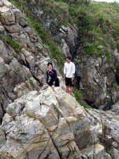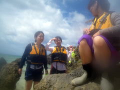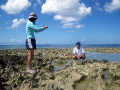 「鯨はどこにいるの?」 と海の中やリーフの上を歩いて島の裏側にやってきました。 お二人の足元にいるんですが、分かりますか?? あ、化石だから、鯨の背骨あたりが写真に写っているんですけれど。 写真だとどうしても分からないですね・・・ 触るとよくわかるんですけど、、。 |