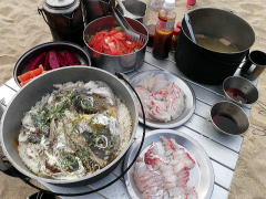最後のお昼ごはんもお刺身の盛りあわせを食べました♪ 魚三昧のキャンプツアー、おしまいです。 |