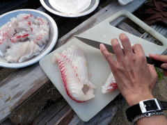 阿嘉島でタマンを釣ったのは漕店大城。 さばいてくれたのはちーちゃんさん。 3日目の朝は鯛めし、タマンのお刺身と、豪華な料理がテーブルを彩りました。 |