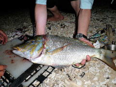 今回最初のヒット!!! O関さん、前回にほど近いポイントでカツオを釣りました〜 これはハッピーアワーのおつまみに、お刺身でいただきました♪ このあと、トータル3日間で次々と大物を釣り上げたO関さん。 オオマチ(和名:アオチビキ)はメイン料理と刺身に、ミーバイはマース煮にしていただきました。 ご馳走さまですっ! |