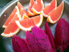 もうすぐ時期が終わってしまうドラゴンフルーツ。 こぶしくらいの大きさで2個150円。 中身が赤色と白色とあるのですが、甘いのは赤色が多いので、こちらを朝ごはんにだしました。 |