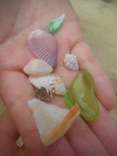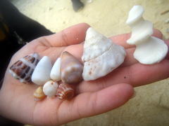 ビーチコーミングで拾ったそれぞれの宝物を見せて、と言って差し出してくれたのがこれ。 左から、つばきのスペシャル、たつみスペシャル、たどころスペシャルです。 海に行く楽しみはいろいろですね〜 |