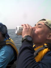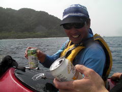 | 慶良間海峡を横断し渡嘉敷アリガーで小休止:やっぱりドリンクはこれじゃなきゃ〜。 |