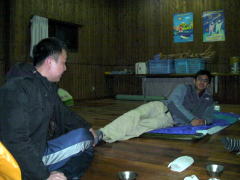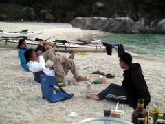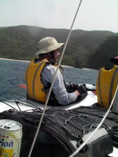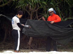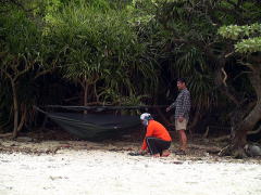 | 2日目午前中:黄砂により視界不良で午後より漕ぎ出そうと言うことで午前中はフリータイム、 そこで適度なモンパの木があるのでハンモックで寝てみようとセッテイングしてみました。 以外にも寝心地は良い。 |