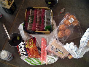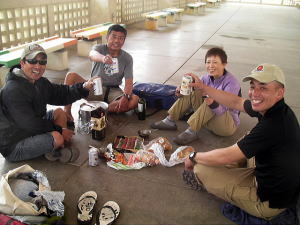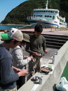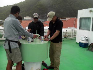 | フェリーに乗船し甲板へ「バーあけみ」のオープンです。 何故かどこからともなくビールに泡盛つまみまでが出てくるんですよね。 |
