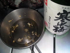 漕店10周年を記念して奥○さんが金粉に日本酒を用意してくれました。 つまみの島らっきょうは小○さんと奥○さんがこしらえてあっという間に食べてしまいました。 |
