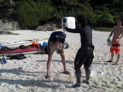 ![]() ![]() ![]() 中:沖縄のことわざで「あまだいみじぇ〜しょうゆじけ〜」:雨だれ水は醤油使い キャンプだからこそ水の大切さを改めて知り残り水で髪を洗う。 これこそエコ心です。 右:慶良間でも一番の絶景でしょう。 ここでは必ず写真を撮ります。 |