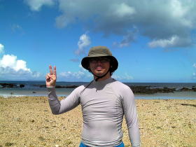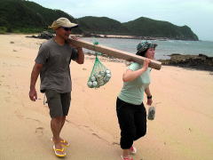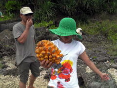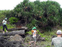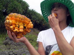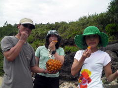![]() ![]() ![]() 10日フェリー欠航が決定。 裏海岸へビーチコーミングへ 「パイナップルがある〜」「取って食べてごらん」 「あれ〜味が違う?」「柿の味がする?」 普段はこんなの食べないがたまには良いか。 |