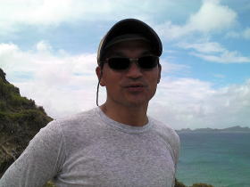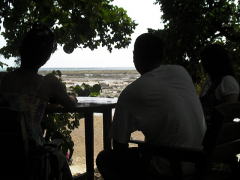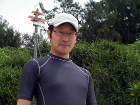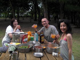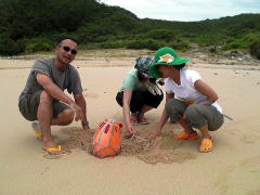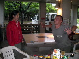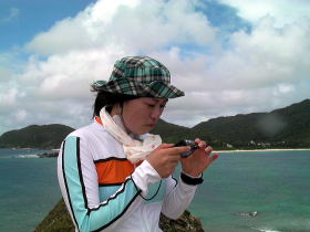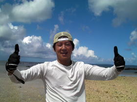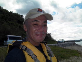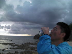 今回のツアーは名古屋から気の会う仲間3人組。 珍しくも8月8日(日)〜10日(火)までのツアーで 8日ツアー当日AM6:00に与那国島近海で熱帯低気圧が発生、 きっと台風になるだろうとわかってはいましたが、 ゲストの方々と当日相談した上で「フェリーは10日の午後には繰り下げ運行するだろうし、 那覇にいてもホテルは満室で帰路の日程も余裕があるので渡嘉敷島へ台風を見に行こう〜」 とツアーは催行決定。 この熱帯低気圧は午後には台風4号になり、 渡嘉敷島あたりの風速は30b近くもあり波の高さも8m〜9mの大時化でした。 そんな中でも国立沖縄青少年交流の家のバンガローは空いているがテント泊しようと屋根つきの野外炊飯場にテント設営し台風4号の苦境を楽しんできました。 |