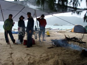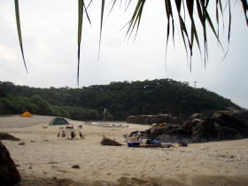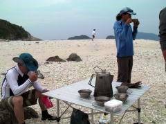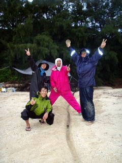 ![]() ![]() 13日:明方からポツリポツリ雨が降り出す。 北風も強く高速船なども欠航となってる。 10:00頃から本格的などしゃ降り・・・。 撥水機能のないタープも少しずつしみてくる。 もちろん停滞キャンプ。 風も雨も強い! タープの強度がこの風に耐えられるかどうかわからないがラインを多めにタープを張ってみた。 時々山からの吹き降ろしの強風が「ゴォ〜」っとやってくるのが聞こえてくる。 そんな時はタープの下にいるメンバーで代わる代わるポールを押さえ、 他参加者は暖かい紅茶に泡盛を割って「こんなキャンプもあるよ」 と楽しそうに時を過ごす。 雨はおさまりそうもないので 「そうだ!ケラマカヤックセンターの宮里祐司へ電話して車で買出し兼島内観光」 をしてもらおうと呼び出す。 元沖縄水産高校カヌー部の先輩後輩のなか 彼の性格だからNOとは言わないだろうと当初からこの計画でした。笑 |