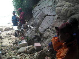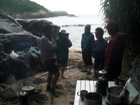 ![]() ![]() 3日目朝:明方から北東の風が強くそれに雨です。 こんな時もあるさ〜。 タープは張れないので風裏の岩場で朝食。 |