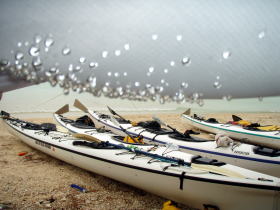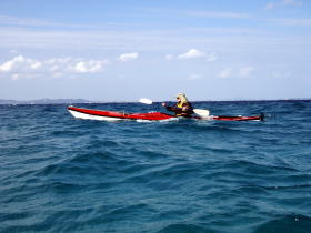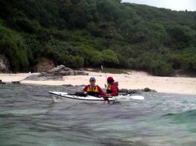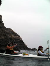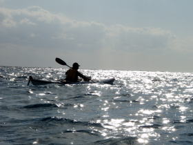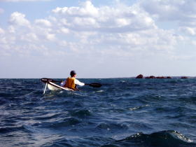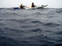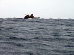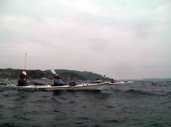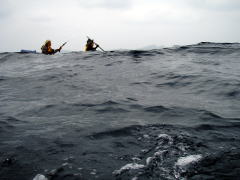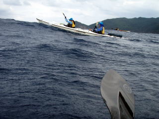 ![]() ![]() 思ったより東の風が強く、ちょうど向かい風に向かい波。 右:カヤックのバウが無い! 波は高くは無いが風波でちょうどバウが波に突っ込んだ状態です。 |