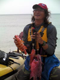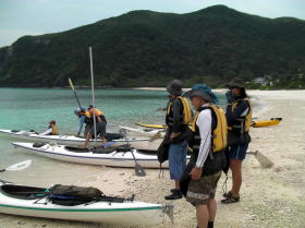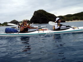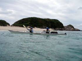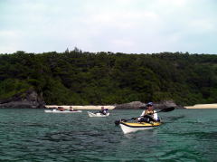 | 11月5日〜7日までの間、愛知県にあるレインボーとのコラボツアーでした。 今回はスタッフ込みで総勢11人パーティーでのツアー、 そんな中でも何時ものキャンプツアーとは違うのが一番の目的が“釣り”。 4人が持って来た釣竿がなんと8本も・・・。 フロントデッキにジギング用の1竿、胸にトローリング用の竿。 初日目キャンプ地に着くと同時に釣り組みはカヤックからパッキングを解き荷物を出すと 「それ急げ〜」っと沖合いにカヤックを漕いで行く。 見通し内ではあるが1時間経ち、それからまた30分が経ち・・・。 陸地ではハッピアワーをやりながら「なかなか戻ってこないね〜」 “野遊び屋”の曲里さんは「どうせ前回同様、釣果無しだよ」笑 するとレインボーの中谷さんがニコニコしながら快適にパドリングして戻ってきた。 コックピットから取り出したのが、なんと! 高級魚のアカジン(スジアラ)にナガジューミーバイ(バラハタ)。 1匹かと思いきや「はいこれ〜、はいこれ〜」と何匹もデッキから取り出したのである。 先ほどの曲里さんは「あれ〜慶良間には魚いないと思ったのに、慶良間に魚はいるさ〜」 と沖縄弁のイントネーションで笑いを取るしまつ。 やぁ〜これまでのレインボーツアーではなかなか釣果が上がらないツアーでしたが、 この数釣れれば、これまで通った成果の証です。 ![]() 釣果はバッチリ しかし、週間天気予報では雨マークは1つも付いてなく、 前回のレインボーツアーの2月末や昨年とは違いまず天気には恵まれるだろうと思いきや 初日目の曇り晴れの天気予報が何故か晩には小雨がぱらつく雨模様。 2日目は晴れ曇りの天気なんだが北東の風が強く向かい風の中 ムカラク島(飛込み島) から海峡横断し阿波連までのノンストップ1時間40分のマジ漕ぎ! 3日目明方からしとしと一日中雨、雨、雨・・・。 最終日に雨って片付けにほんと困りますよね。 |