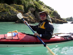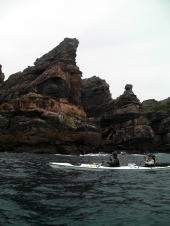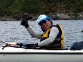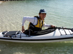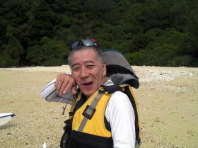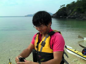 ![]() 昨年9月の漕店ツアーの際にムカラク島で偶然に会ったソロカヤッカーの中○さん。 その後、今年の9月レインボーの常神ツアーに便乗させてもらった際に会い「あれ〜ムカラク島で会いましたよね〜」と。 |