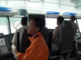 ![]() ![]() 毎年11月はフェリーけらまがドッグ入りの為、AM9:00の高速船マリンライナーで渡嘉敷島に向かいます。 今回最年少ツアー参加者のシューゴ君は特別に操舵室へ見学に体験操船。 蛇行操船でしたが将来の船長まちがありません。 |