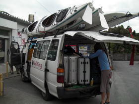![]() 漕店号のハイエースにカヤックに装備食料はフェリーが運航しているときに前もって送ってました。 11人分となるとかなりの積載です。 |