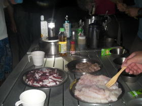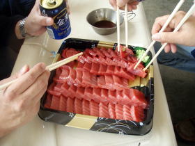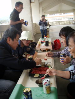 ![]() ![]() 渡嘉志久湾まで無事に到着。 片付け終了後、フェリー出港までの間 渡嘉敷漁協の鮪刺しで昼食。 |