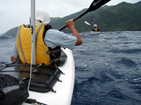 ![]() ツアー前日の天気予報では13日14日に小雨が降るだろうとの予報。 ツアー初日目、北東の風がやや強く波の高さ2,5m。 (僕の天気予想では翌日からは風が強く雨を伴い大時化だろう?) どうにかツーリング移動は出来るのでその場所には行きたくないのだが 慶良間の中でも一番安全と思っている座間味島の安護の裏湾の奥の浜辺で 停滞キャンプを覚悟で渡嘉志久湾からスタートしました。 慶良間海峡を通過する際は横風ではあるが2階建てぐらいの波が何度か攻めてきた。 でも波頭は崩れないので「お〜お〜」とカヤッカーらしい低い悲鳴をあげていた。 |