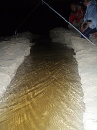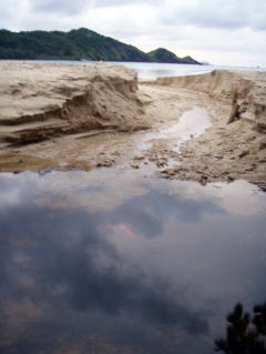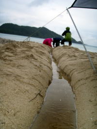![]() ![]() 池の水が少しずつ流れていく。 更に載り面が崩れる。 流れがあると崩れた砂は少しづつタイドラインに流れていく。 時には流れに流されモクズカニやウナギも流されて行く。 10分、20分・・・更に1時間。 分ごとに水圧が増し10cm幅のバイパスが水圧によって30cm次第に50cmと 幅が大きく広がっていく。 Sアニーのテントサイトまで攻めてきていた水は次第に流れとともにひいていった。 計画通りの排水作業に歓声はその晩遅くまでずーっと続くのであった。 |