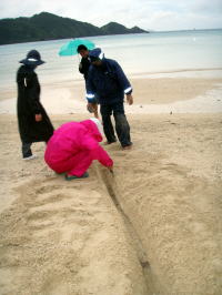 ![]() 14日朝、雨風もおさまり海も凪になった。 元あった10cmの幅は翌日は3mの幅になり、 タイドラインには砂州ができていた。 重機がないとできない土木作業でも 皆の知恵と手作業で川の流れも変えられる。 |