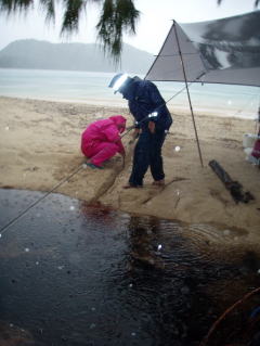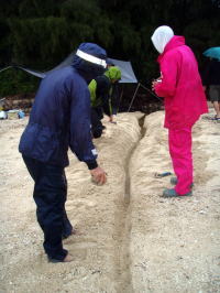 ![]() 作業開始から1時間あまり、雨の中どうにかタイドラインまで到達した。 みんな喜びの歓声である。 |