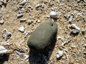 ![]() エージナ島に上陸しカヤックを砂浜へ上げようとしていたら拳よりやや小さいめのこのような石が・・・。 どうみても人の手が加わった加工痕が? 今日のゲストのK村さんは発掘調査のスペシャリスト本業が発掘調査業。 「これって何ですか?」と聞いてみたら これは昔の漁師の漁具で、なんと釣りようの重りで凄い発見らしい。 |