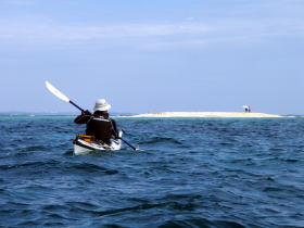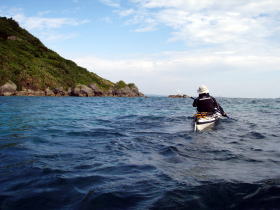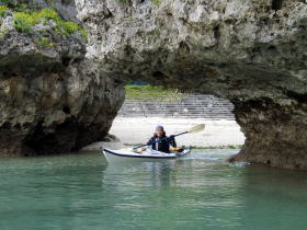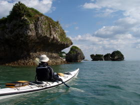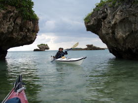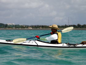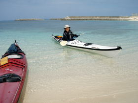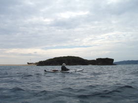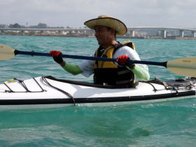 今日のツアー参加者 K川さんは沖縄在住なんですが 東京へ長期出張で秋の一番良い時期のパドリングを逃してしまった・・・残念。 東京でのストレスが解消できず出張中の合間に シーカヤックを漕ぐ為に沖縄に帰ってきました。 しかし、ここのところ天候が不安定でツアー予約は請けてはいるのものの北風が強くツアーは全て中止、 これじゃ〜強い北風でも漕ぐ場所を探してでも多少は漕がなければと、かなり強行的にツアーを行いました。 今日のコースは漕店初のコース、 南城市奥武島をスタートの海岸沿いを東に漕いで 新原ビーチ〜百名ビーチ〜アージ島・アドキ島〜知念海岸のとある隠れたビーチまで 北風でも安全なコースプランになりました。 |