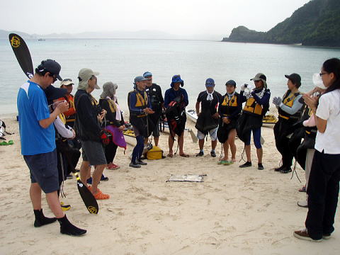 | 出発前の自己紹介にブリーフィング。 あれ〜右側に以前漕店スタッフだったマーキーが・・・ ツアー参加者の方々。 |