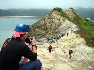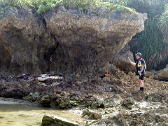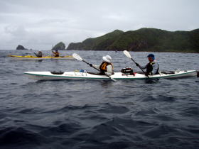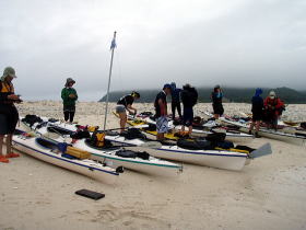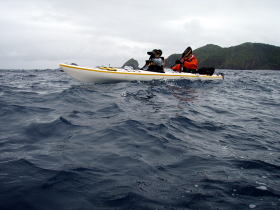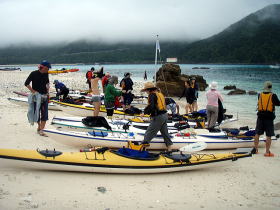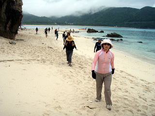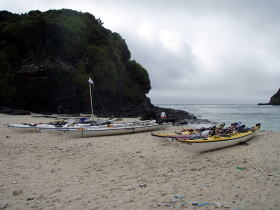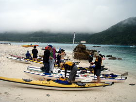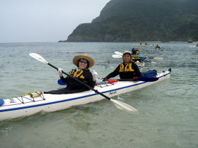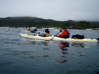 | ツアー初日 5月2日 大潮で天候は南の風で雨・・・ 追い風追い潮に乗って渡嘉志久湾から風裏側の儀志布島へ向かう。 |