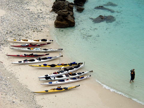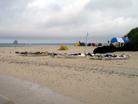 ![]() ハナレの山の上から見た今回の使用カヤック。 |