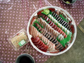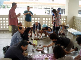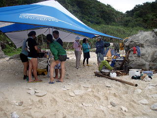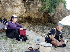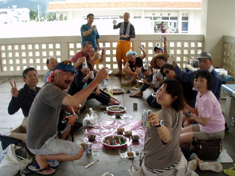 | 4日目昼食時 渡嘉敷漁協で刺し盛を購入し那覇からじゅうしーお結びを送ってもらい昼食にしました。 今回は大パーテイーでのツアーでしかも雨、 雨にも負けず楽しんできました。 参加者の皆さんありがとうございました。 またのお越しをお待ちしております。 蛸敏 |